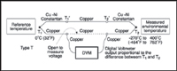 Figure 1. A basic thermocouple measurement system requires two sensors, one for the environment under measurement and the other, a reference junction, normally held to 0°C (32°F). Type T is one of the dozen or more common thermocouples used in general-purpose applications. Made of copper and constantan metals, it typically operates from –270°C to 400°C (–454°F to 752°F).