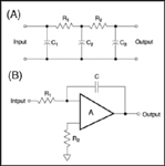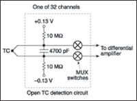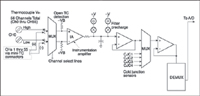 Noisy Environments. Because thermocouples generate a relatively small voltage, noise is always an issue. The most common source of noise is the utility power lines (50 or 60 Hz). Because thermocouple bandwidth is lower than 50 Hz, a simple filter in each channel can reduce the interfering AC line noise. Common filters include resistors and capacitors and active filters built around op-amps. Although a passive RC filter is inexpensive and works well for analog circuits, it's not recommended for a multiplexed front end because the multiplexer's load can change the filter's characteristics. On the other hand, an active filter composed of an op-amp and a few passive components works well, but it's more expensive and complex. Moreover, each channel must be calibrated to compensate for gain and offset errors (see Figure 8).