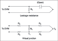 A thermocouple's output can change also when its insulation resistance decreases with increasing temperature. The change is exponential and can produce a leakage resistance so low that it bypasses an open-thermocouple wire detector circuit. In high-temperature applications using thin thermocouple wire, the insulation can degrade to the point of forming a virtual junction (see Figure 9). The DA system will then measure the output voltage of the virtual junction at T1 instead of the true junction at T2.