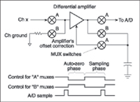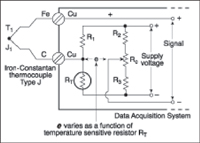Hardware Compensation. A polynomial approach is faster than a look-up table and a hardware method is even faster because the correct voltage is immediately available for scanning. One technique is to add a battery to the circuit to null the offset voltage from the reference junction so the net effect equals a 0°C junction. A more practical approach based on this principle is an "electronic ice point reference," which generates a compensating voltage as a function of the temperature-sensing circuit powered by a battery or similar voltage source (see Figure 7A). The voltage then corresponds to an equivalent reference junction at 0°C.