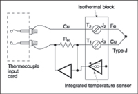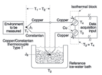 The above example is a special case, however, because one lead of the type-T thermocouple is copper. A constantan-iron thermocouple needs further consideration (see Figure 4). Here, J2 in the ice bath is held constant, and J1 measures the environment. Although J3 and J4 are effectively thermocouple junctions, they are at the same temperature on the isothermal block, so they output equal and opposite voltages and thus cancel. The net voltage is then the thermocouple J1 output representing T1, calibrated to the NIST standard table. If the I/O block were not isothermal, copper wire leads would be added between the input terminal and the copper-iron leads, and the copper-iron junctions (J3 and J4) would be held in an ice bath as well (see Figure 5).