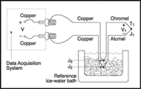 Figure 5. The chromel and alumel wire connections at the copper leads constitute additional thermocouple junctions that must be held at the same, constant temperature. They generate equal and opposite potentials that prevent them from contributing to the voltage output from the chromel-alumel thermocouple.